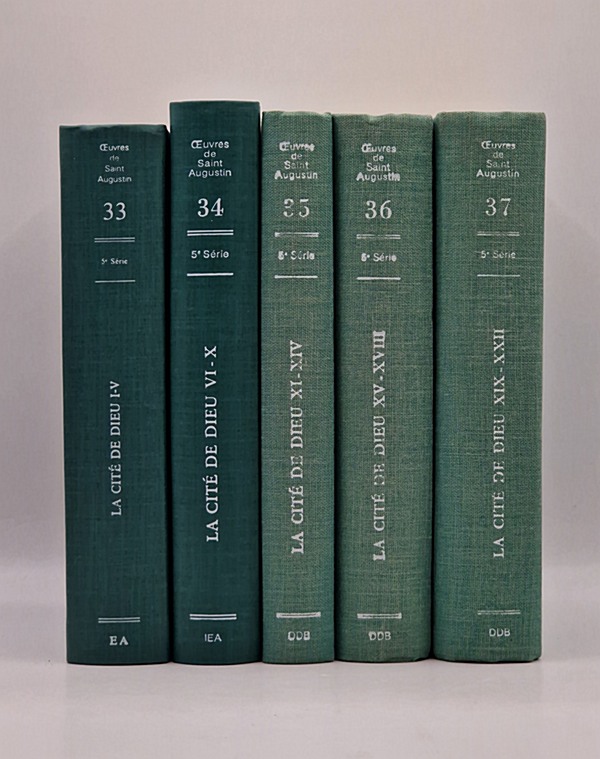 Tome I : Livres I-V. Impuissance sociale du paganisme (1959). Tome II : Livres VI-X. Impuissance spirituelle du paganisme (1996). Tome III : Livres XI-XIV. Formation des deux cités (1959). Tome IV : Livres XV-XVIII. Luttes des deux cités (1960). Tome V : Livres XIX-XXII. Triomphe de la cité céleste (1960). Texte de la quatrième édition de B. Dombart et A. Kalb. Introduction et notes par G. Bardy. Traduction française de G. Combès.