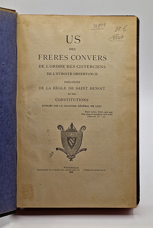 Westmalle, Ordre des cisterciens de l'étroite observance, 1928 ; in-8° relié demi-toile noire (dos muet, trace de pièce de titre), 367 pp.