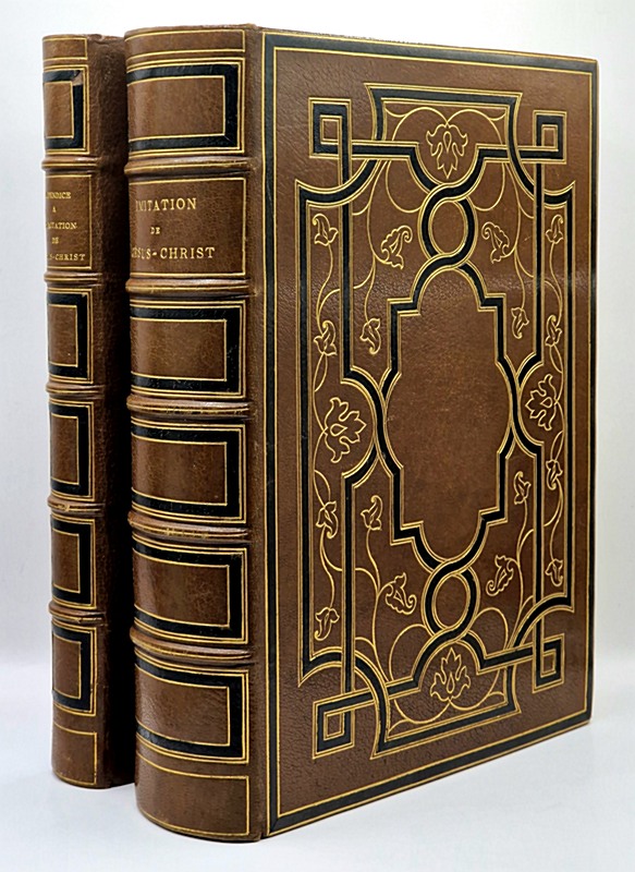 Imitation. Paris, Léon Curmer, 1856 ; fort in-8° relié plein maroquin cannelle, dos à nerfs orné, plats entièrement ornés d'entrelacs noir et or avec motifs végétaux, tranches dorées, gardes de moire vieux rose et large roulette intérieur portant signature « L. Curmer », (8)-XII-(3)-399-(3)-XIV pp.