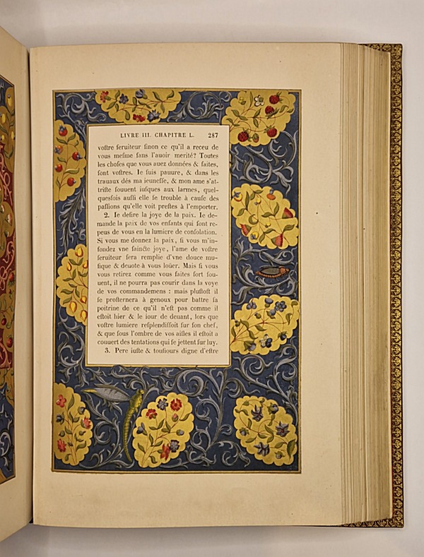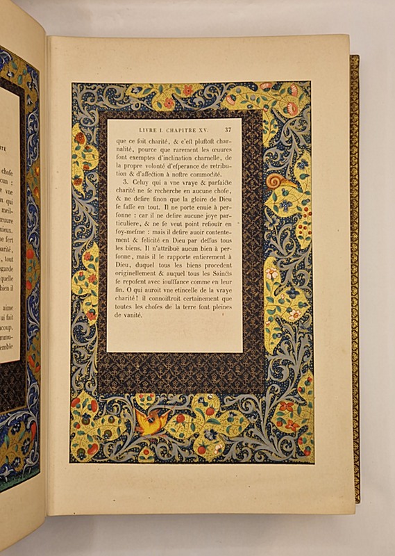 Toutes pages montées sur onglet, pourvue chacune d'un large encadrement en couleurs d'inspiration médiévale. Cet ouvrage a nécessité l'utilisation de plus de neuf cents pierres lithographiques, de trois à quatorze couleurs, et constitue l'une des plus belles productions de Léon Curmer.