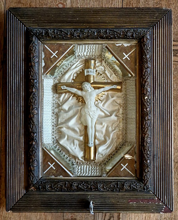 Au centre, Christ en cire blanche sur croix de cire dorée, couché sur fond de soie blanche festonnée sur les côtés avec, en angles, quatre miroirs taillés en trapèze ; encadrement de bois ouvragé, fermé d'une vitre (menus défauts sur le bois d'encadrement, sans fragilité).