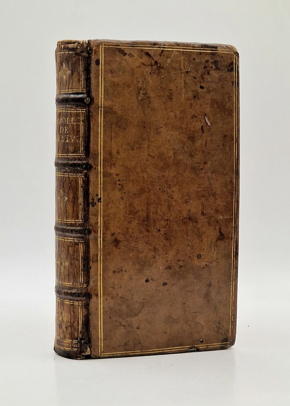 Deux ouvrages reliés en un in-12 plein veau blond (deux mors légèrement fendus sur un centimètre, trois coins émoussés, nonobstant reliure entière et solide), dos à nerfs orné (coiffes absentes), tranches rouges, petit trou de ver en marge inférieure des feuillets, loin du texte.