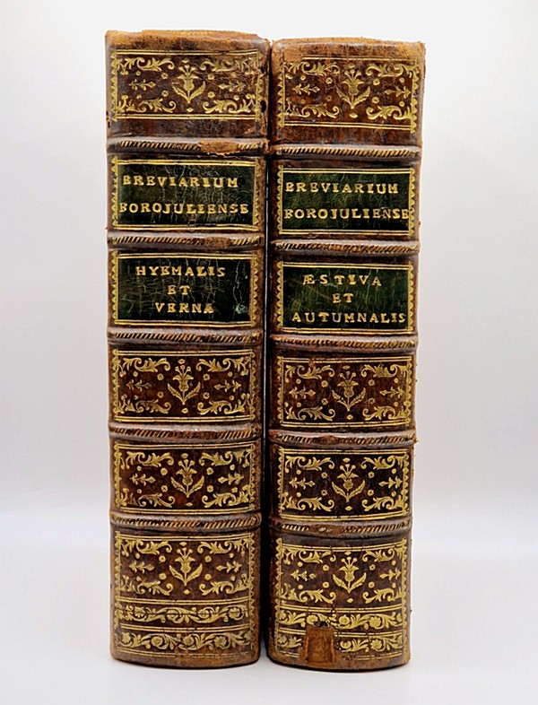 Paris, Claude Simon, 1787 ; quatre saisons en deux volume reliés pleine basane brune de l'époque (épidermures sur les plats, petit manque de cuir en queue du premier volume et un mors du tome II ébréché sur deux centimètres), dos à nerfs richement ornés, pièces de titre vertes, tranches rouges, roulette sur les champs, vignettes de titre, culs-de-lampe, texte sur deux colonnes, grande fraîcheur intérieure, XIX-880-LXXVIII et XX-976-LXXXIV pp.