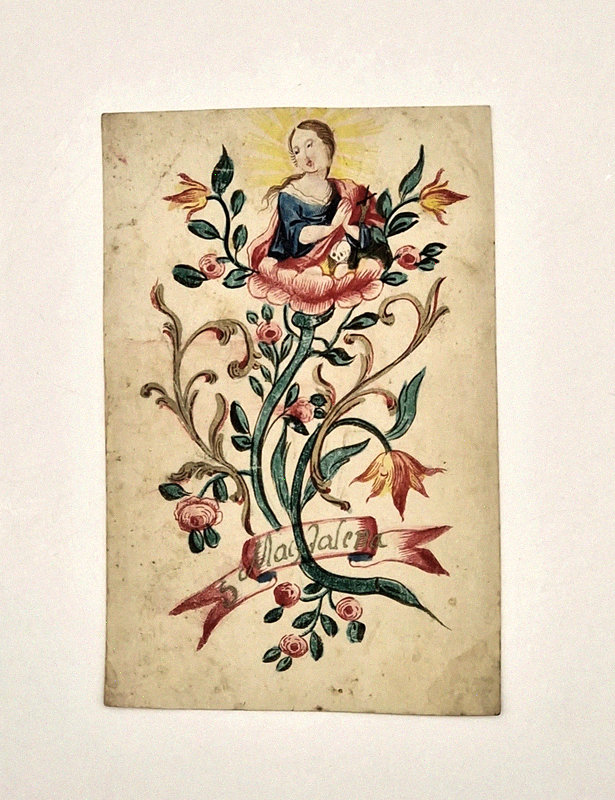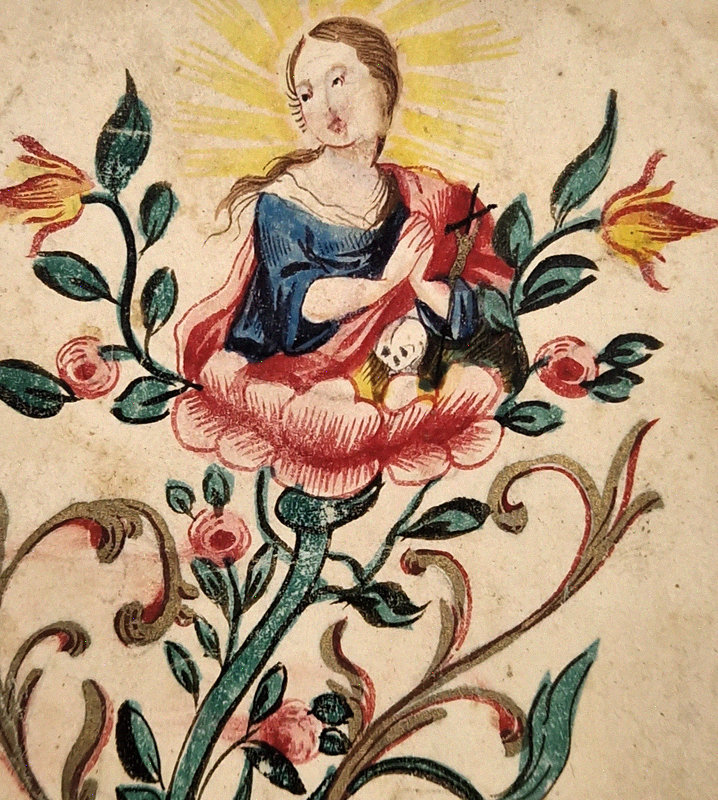 Buste de Marie Madeleine en rose mystique, représentée avec les attributs de la sainte, soit un crâne et la croix ; décor de roses et de lis martagons.