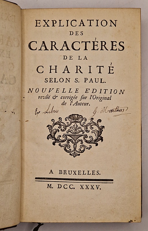 Bruxelles, s. e., 1735 ; petit in-8° relié pleine basane de l'époque, dos à nerfs orné (frotté, dorure légèrement passée, coiffes absentes, nonobstant reliure solide), tranches rouges, ex-libris ancien en page de titre, bandeaux et culs-de-lampe, III-XXXV-459 pp. Jacques Joseph Duguet (1649-1733) était un moraliste français. Voltaire le considérait comme « l'une des meilleures plumes du parti janséniste » (Le Siècle de Louis XIV).
