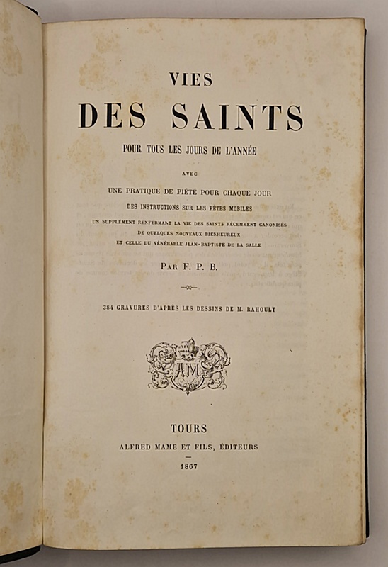 Avec une pratique de piété pour chaque jour, des instructions sur les fêtes mobiles, un supplément renfermant la vie des saints récemment canonisés de quelques nouveaux bienheureux et celle du vénérable Jean-Baptiste de La Salle. 384 gravures d'après les dessins de M. Rahoult.