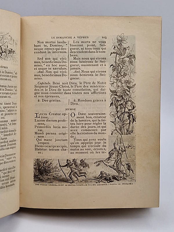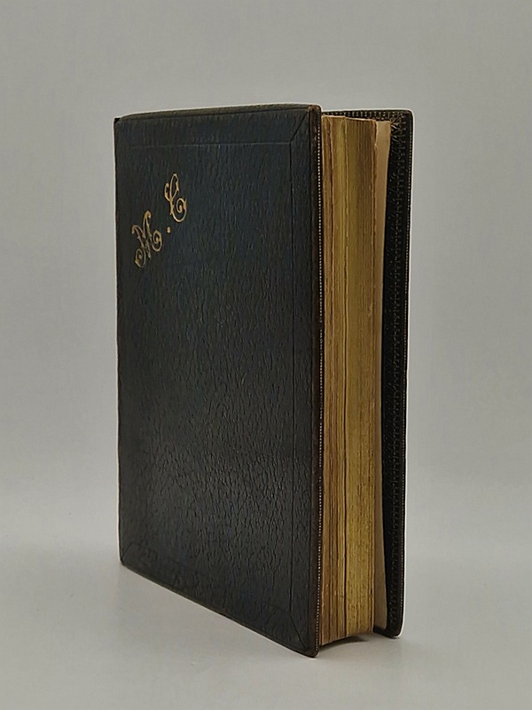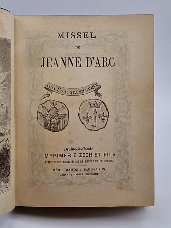Braine-le-Comte, Zech et Fils, 1895 ; petit in-8° relié plein maroquin vert foncé, dos à nerfs, tranches dorées, roulette intérieure, frontispice, encadrement en équerre représentant des scènes de la vie de Jeanne d'Arc à chaque page, 2 gravures recto-verso hors texte, 438 pp.