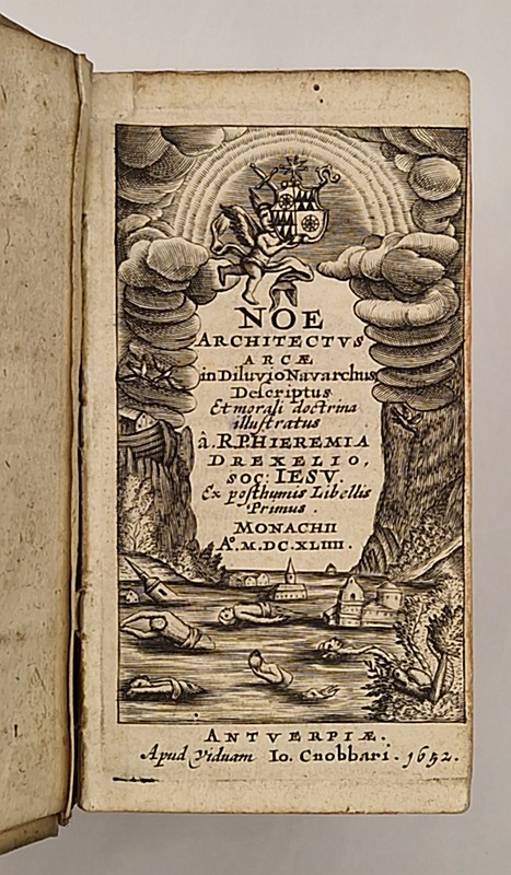 Anvers, Io. Cnobbari [Joannes Cnobbaert], 1652 et 1641 ; deux ouvrages reliés en un in-16 plein vélin de l'époque à rabats, auteur et titres manuscrits, et petite étiquette au dos, tranches rouges portant une inscription manuscrite en partie effacée, deux beaux titres-frontispices, l'un représentant le déluge et l'autre une scène de la vie de Joseph, tampons, (8)-232-(12)-321 pp. Jérémie Drexel (1581-1638), orateur sacré de renom converti au catholicisme, a grandement influencé la spiritualité allemande de son époque.