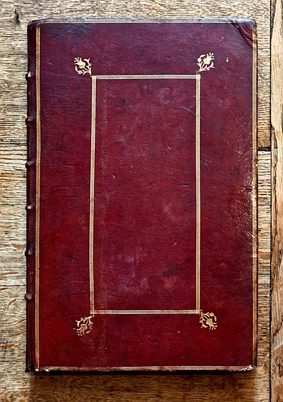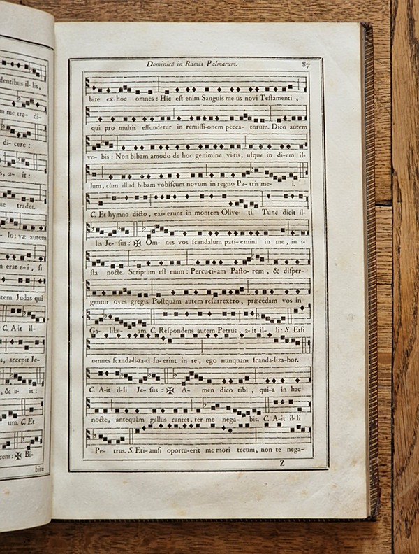 Nancy, H. Haener, 1787 ; in-folio relié plein maroquin rouge de l'époque (deux coins usés, quelques épidermures), dos à nerfs richement orné (coiffes ébréchées), plats portant un double décor de triple filet doré avec écoinçons floraux, roulette dorée sur les champs, ex-libris et inscriptions manuscrits anciens en pages de garde avec manque de papier, armes de Dom Jean-Baptiste L'Écuy gravées en vignette de titre, tampon, texte sur deux colonnes, nombreuses partitions en notation carrée, 318-XXXVII pp. Bel exemplaire peu commun.