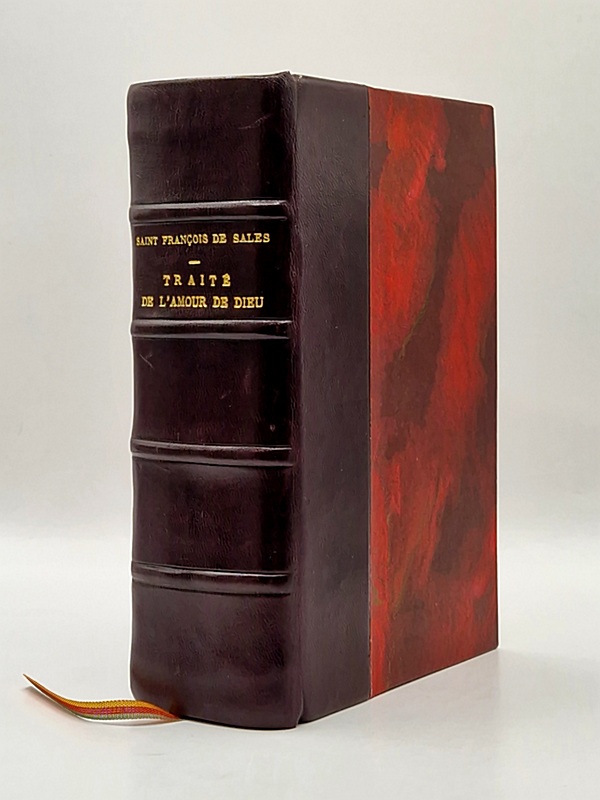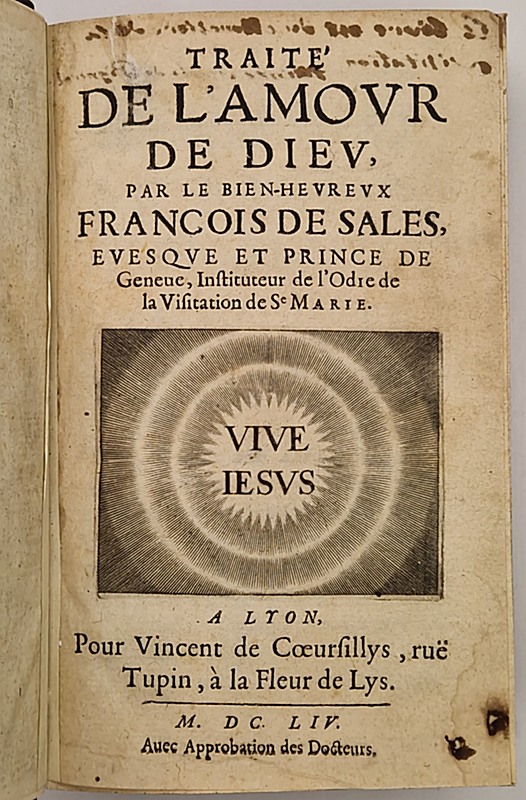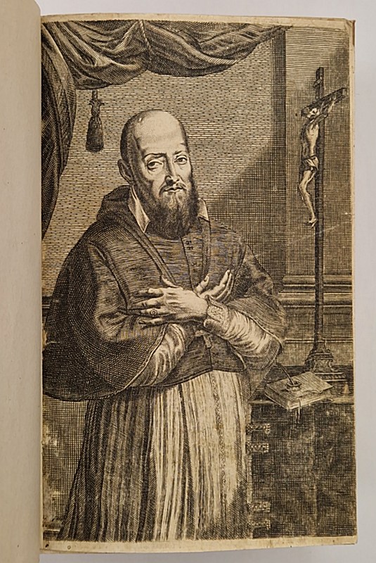 Lyon, Vincent de Coeurfillys, 1654 ; petit et fort in-8° relié demi-basane bordeaux foncé (bonne reliure moderne), dos plat à nerfs, un beau portrait-frontispice gravé en taille-douce, belle vignette de titre gravée, ex-libris ancien, culs-de-lampe, lettrines et bandeaux, 1009-(16) pp.