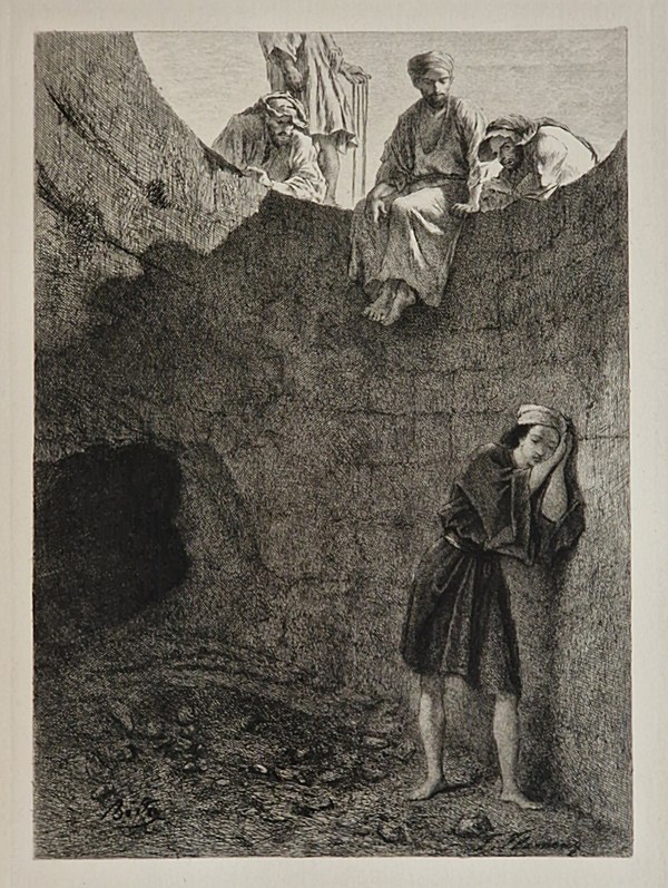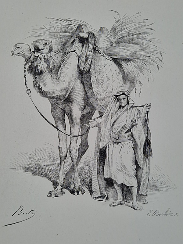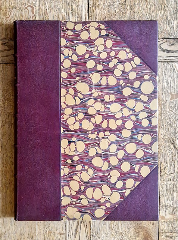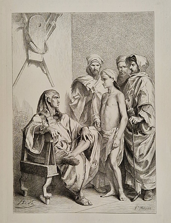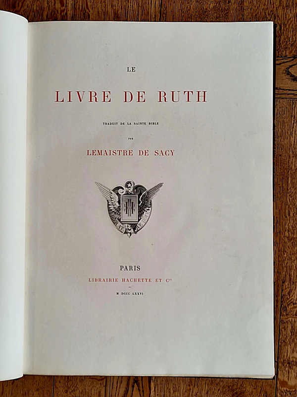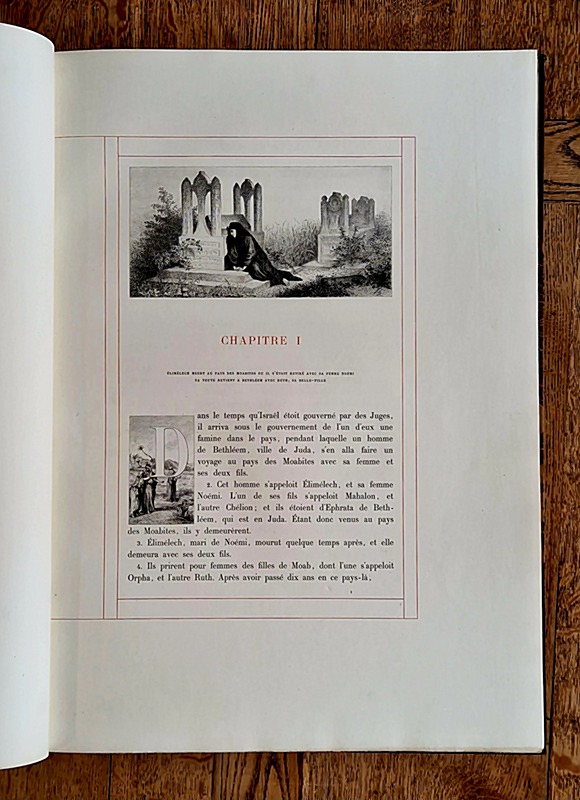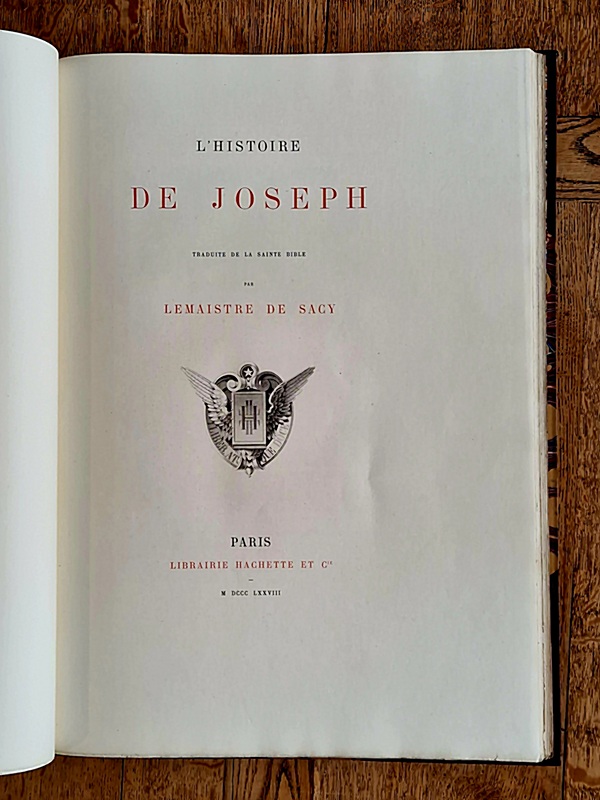 Paris, Hachette, 1876 et 1878 ; in-plano relié demi-maroquin lie-de-vin à coins, dos à cinq nerfs (quelques griffures superficielles sur un plat), tête dorée, texte encadré d'un double filet rouge, (6)-13 et (1)-53 pp. Bandeaux et vignettes historiés, grandes lettrines illustrées, ainsi que, pour Le Livre de Ruth, neuf planches et, pour L'Histoire de Joseph, vingt planches dues au talent d'Alexandre Bida. Cette édition de luxe fut tirée à 150 exemplaires imprimés sur papier de Hollande, le présent et très bel exemplaire porte le n° 5.