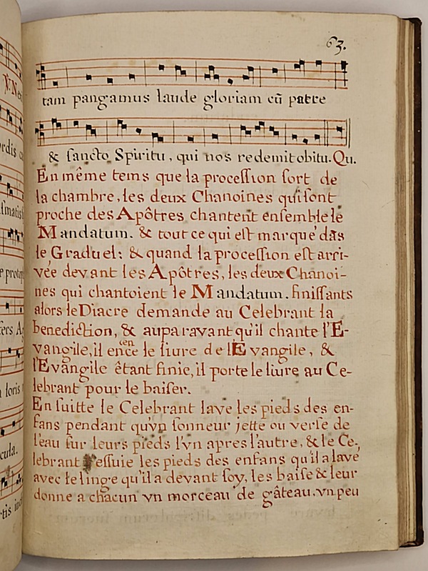 Ouvrage manuscrit sans éditeur et sans date (XVIIIe siècle). Petit in-4° relié plein veau de l'époque (frotté par endroits, épidermures), dos à nerfs (muet, manque de cuir en queue), tranches mouchetées de rouge, texte manuscrit rouge et noir accompagné de portées musicales en notations carrées, 168 pp.
