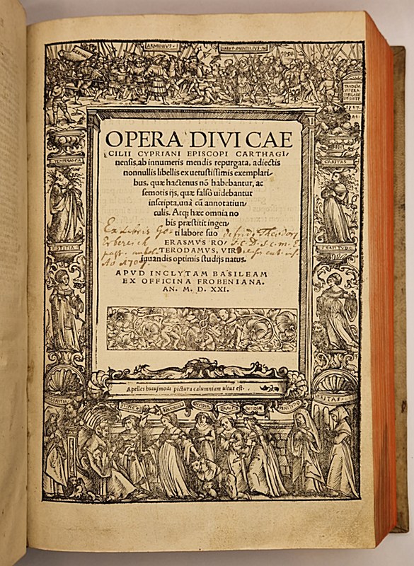 Deux ouvrages (dont le premier en trois tomes) reliés en un fort volume in-4° plein vélin, dos plat portant auteur et titre manuscrits, tranches rouges, ex-libris ancien et moderne. Les deux ouvrages semblent avoir été placés, au XIXe siècle, dans une reliure de vélin XVIIe – tous deux, tout particulièrement le second, ont vu leurs marges rognées et leurs tranches rougies. Pour le premier ouvrage : Anvers, Johannes Steelsius, 1568 ; trois tomes reliés en un volume, ex-libris ancien et tampon, grande et belle marque de l'imprimeur gravée en page de titre, mouillure claire en marge supérieure de plusieurs feuillets, fines et anciennes inscriptions manuscrites sur de nombreux feuillets, lettrines et culs-de-lampe, (108)-607-(2) pp. (pagination continue pour les trois tomes). Pour le second ouvrage : Bâle, Apud Inclytam Basileam ex Officina Frobeniana [Froben], 1521 ; ex-libris ancien et tampons, bandeaux et belles lettrines (dont certaines historiées), quelques inscriptions manuscrites anciennes dans les marges. Beau et grand titre-frontispice historié typique de l'humanisme allemand du XVIe siècle, signé Ambrosius Holbein (monogramme) et daté 1517. On y trouve des représentations de la bataille de Teutobourg, les vertus sous forme allégorique et la calomnie d'Apelle. Le titre-frontispice est suivi par un bel encadrement gravé en première page de la préface ; on trouve en fin d'ouvrage la marque de l'imprimeur Froben (caducée à l'oiseau), (24)-515-(32) pp. Très grande fraîcheur intérieure. Cette seconde édition des oeuvres de Cyprien de Carthage (la première date de 1512) a largement été remaniée par Érasme.