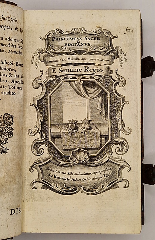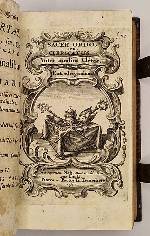 Ex Ducali Campidonensi Typographia [Kempten], Per Joannem Mayr, 1717 ; petit et fort in-8° relié plein veau brun (reliure légèrement postérieure, épidermures), dos à nerfs (tomaison et titre manuscrits estompés au dos, petite perforation en tête, sans gravité), double fermoir métallique avec languette de cuir, tranches mouchetées de rouge, ex-libris moderne, certains feuillets légèrement brunis, 771-(15) pp. Cet exemplaire constitue le second tome d'un ensemble de deux (le premier ayant été publié en 1715). Titre-frontispice absent, quatre belles planches gravées en taille-douce (dont deux signées « I. H. Storcklin »), lettrines, culs-de-lampe. On doit ce manuel illustré à Felix Egger (1659-1720), religieux bénédictin de Bavière et éminent historien de son ordre.