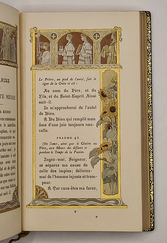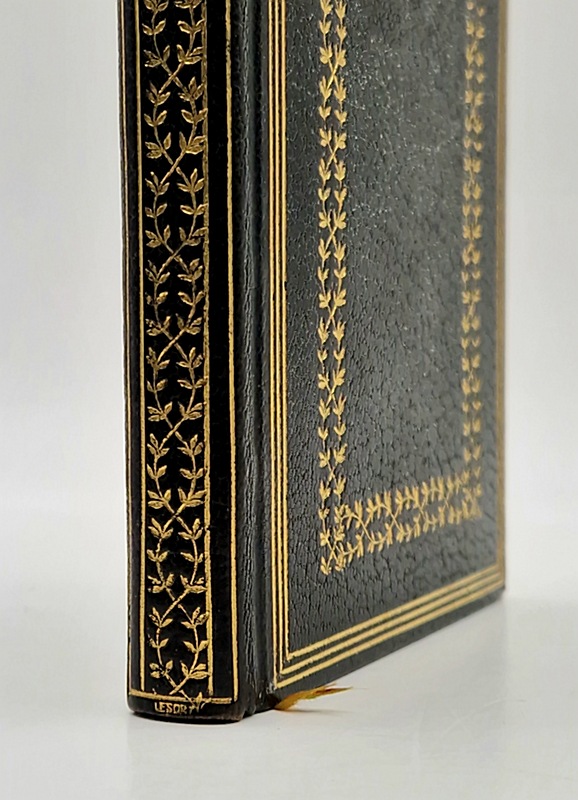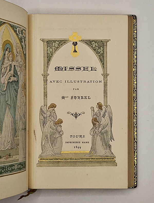 Tours, Mame, 1899 ; petit in-8° relié plein maroquin vert bronze, dos lisse orné d'entrelacs de feuillages or que l'on retrouve sur les plats avec triple encadrement de filets dorés, tranches dorées, large et riche roulette intérieure, gardes de moire beige, reliure signée en pied « Lesort », 80 pp. Toutes pages montées sur onglet, illustrées de belles figures et de décors chromolithographiés, avec rehauts dorés, dus au talent d'Élisabeth Sonrel, grande figure de la période symboliste. Bel exemplaire, en parfait état, dans son coffret d'origine de l'éditeur.