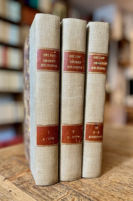 Petit-Montrouge, Migne, 1847 ; 3 vol. in-8° reliés demi-toile beige (couvertures d'origine en partie conservées), pièces de titre et de tomaison, mouillures claires en fin du tome I. Manque ici un quatrième tome : Supplément où l'on trouve l'histoire des congrégations omises par Hélyot, établi par l'abbé Tochou. Chaque volume s'achève par une série de planches hors texte représentant plusieurs centaines de costumes et habits religieux.