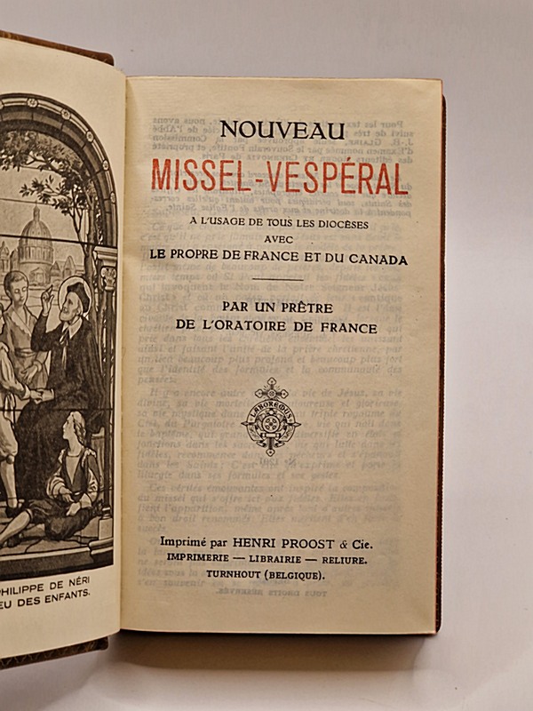 Turnhout, Henri Proost, 1949 ; in-12 relié plein veau, dos à quatre nerfs (prolongés sur les plats), tranches dorées, gardes de moire beige, roulette intérieure, frontispice, 1092-20* pp.Nouveau Missel-Vespéral. Nouveau Missel-Vespéral.