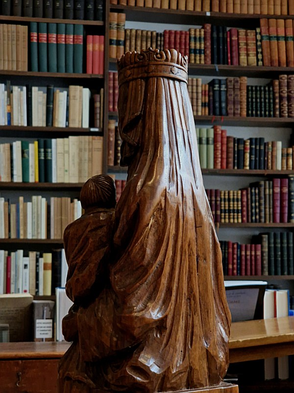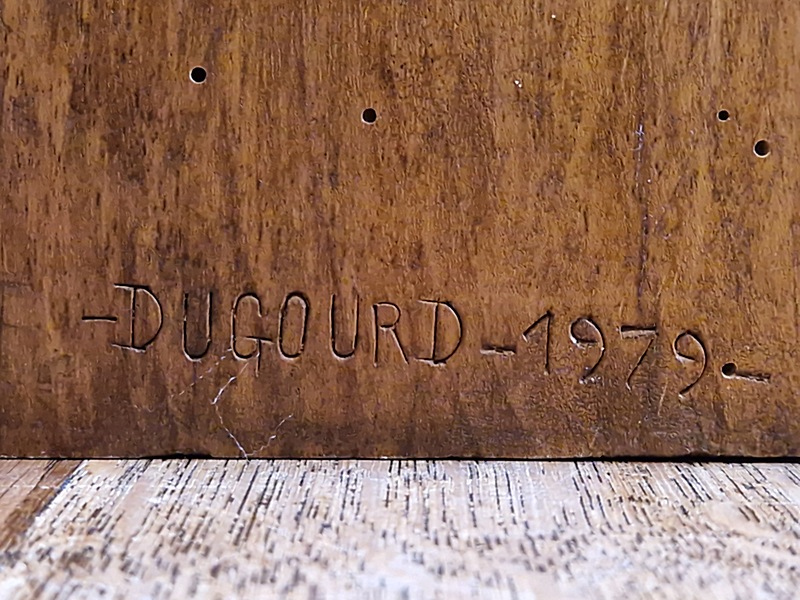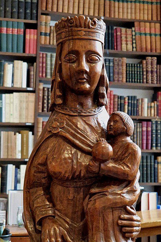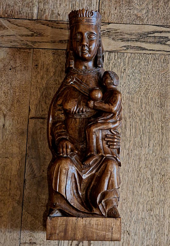 Très belle Vierge couronnée portant l'Enfant Jésus, sculptée sur bois, de style médiéval, datée de 1979 et signée « Dugourd ».