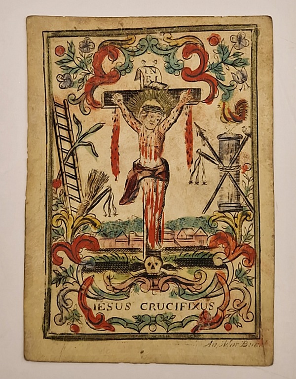Image de piété gravée sur vélin, représentant le Christ en Croix entouré des instruments de la Passion, rehaussée à la main de couleurs. Cette vignette d'assez petites dimensions (6,5 x 9,4 cm) est due au travail d'un graveur de la fin du XVIIe dont le nom, au bas de l'image, est presque illisible.