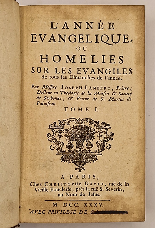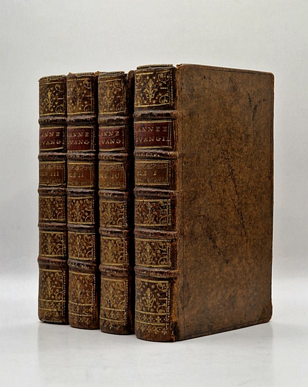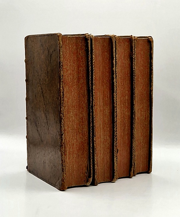 Paris, Christophe David, 1735 ; 4 vol. in-12 reliés plein veau de l'époque, dos à nerfs richement orné (coiffes supérieures des quatre volumes et coiffe inférieure du tome troisième absentes, coins émoussés, parfois usés) tranches mouchetées de rouge, les mots « Sa Majesté » ont été caviardés en page de titre, vignettes de titre, bandeaux et culs-de-lampe. Complet.