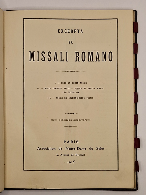 I. Ordo et Canon Missae. II. Missa tempore belli. Votiva de Sancta Maria pro defunctis. III. Missae de Solemnioribus festis.