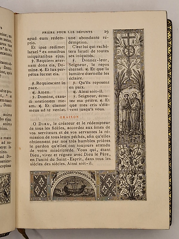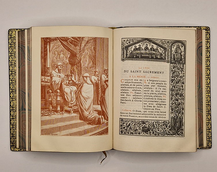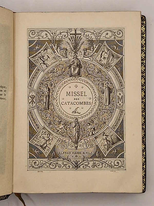 Tours, Alfred Mame et Fils, 1900 ; in-8° relié plein maroquin vert de chrome (légères traces d'usures, notamment aux coins), tranches dorées et marbrées, gardes de moire vert obscur, large roulette intérieure, titre-frontispice, sept planches gravées représentant les sacrements dans l'Antiquité chrétienne par Luc-Olivier Merson (monochrome au recto, à la sanguine au verso), bel encadrement en équerre sur chaque page – quelques fois accompagné de vignettes historiées – inspiré de l'art chrétien primitif, 544 pp.