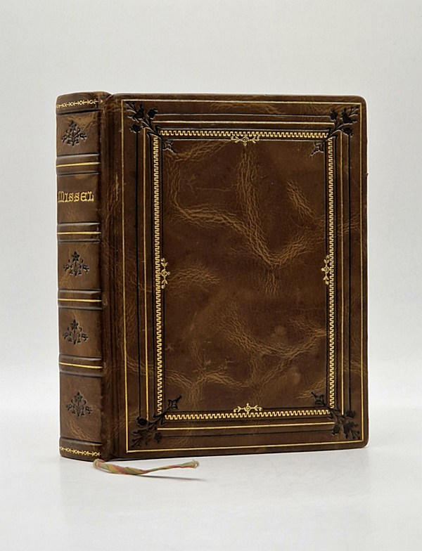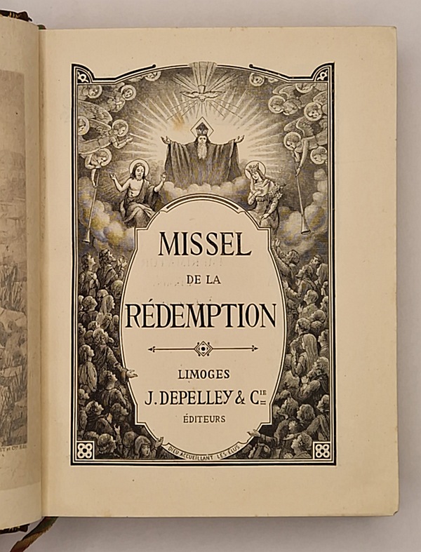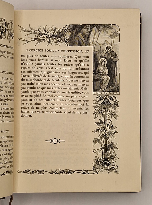 Limoges, J. Depelley, 1912 ; in-8° relié plein veau glacé, dos à nerfs orné de fleurons estampés au centre de chaque caisson, encadrements de six filets estampés et dorés avec écoinçons floraux dorés à froid sur le premier plat, encadrement de filet doré sur le second plat, tranches dorées, roulette intérieure, gardes de moire verte, trois planches gravées (dont frontispices), large encadrement gravé comportant des scènes de la vie de Jésus sur chaque page, 504 pp.