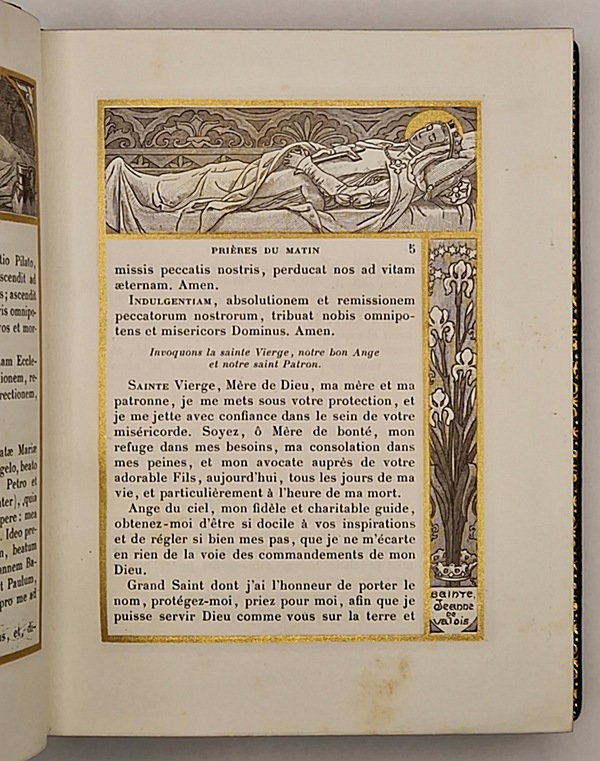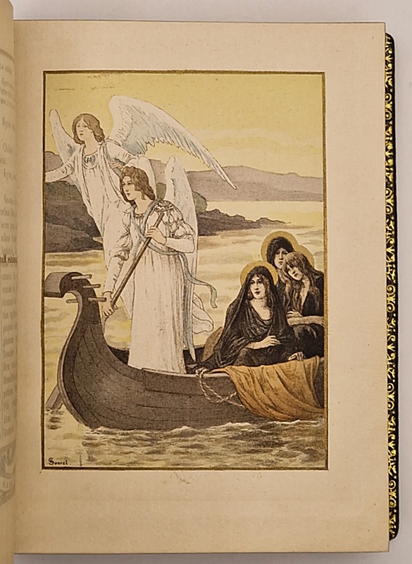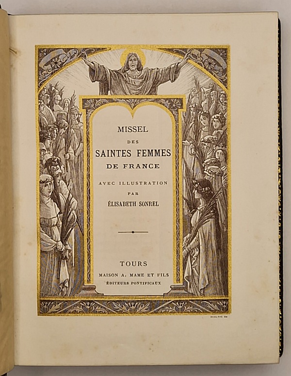 Tours, Alfred Mame et Fils, 1900 ; in-8° relié plein maroquin brun, dos plat, tranches dorées et marbrées, large dentelle intérieure, gardes de moire kaki, quelques rares rousseurs éparses, 319 pp. Ce bel ouvrage illustré avec élégance par Mademoiselle Sonrel présente dix superbes gravures chromolithographiées (dont le frontispice). On trouve à chaque page un large encadrement en équerre comportant un décor floral et une vignette représentant une femme illustre de la chrétienté (sainte, religieuse ou mystique) à l'encre brune, sépia ou bleutée avec rehauts dorés.