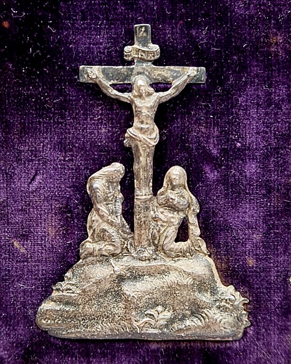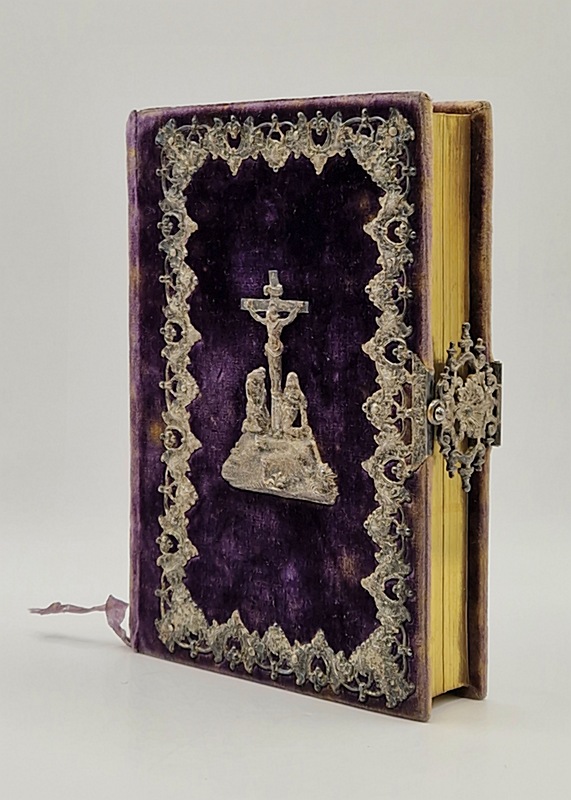 Paris, Belin-Leprieur, s. d. [1810-1850] ; petit in-8° relié plein velours de soie aubergine (frotté), encadrement de dentelle argentée sur les plats, dont un calvaire en bas-relief sur la face avant, large fermoir métallique ouvragé, tranches dorées, gardes de papier gaufré blanc, ex-dono manuscrit ancien, quatre planches gravées (dont frontispice), titre-frontispice chromolithographié, 384 pp.