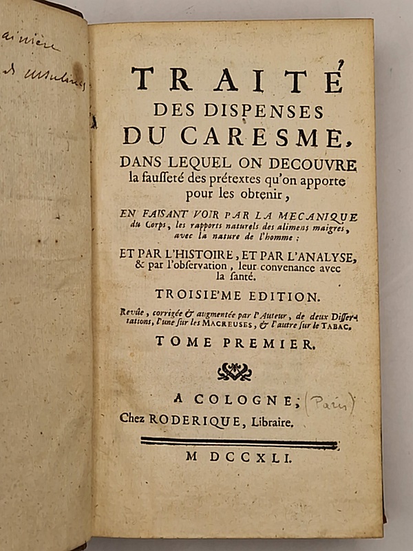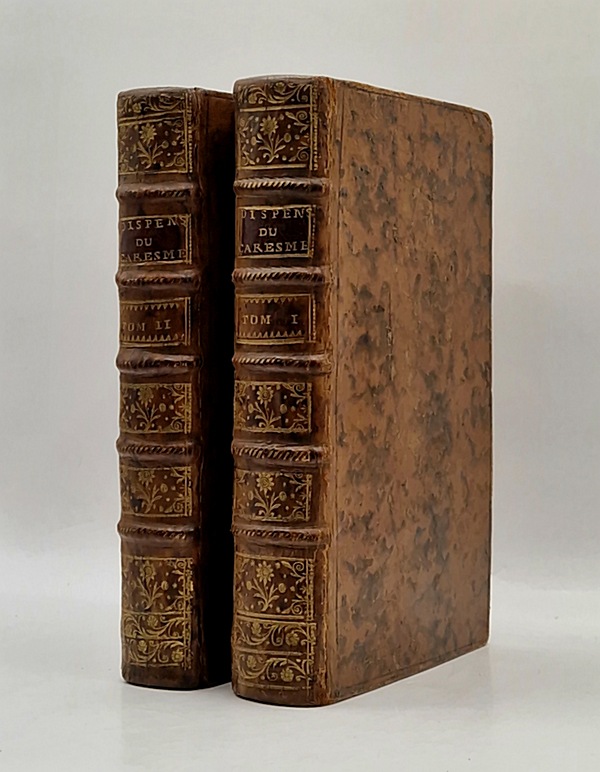 Cologne [Paris], Roderique, 1741 ; 2 vol. in-12 reliés plein veau de l'époque raciné (coins légèrement émoussés), dos à nerfs richement orné, ex-libris manuscrits anciens, bandeaux, lettrines et culs-de-lampe gravés, (44)-509-(18) et 529-(14) pp. Rare exemplaire de cet ouvrage aux frontières de la théologie, de la liturgie et de la médecine alimentaire. Nous recommandons tout particulièrement aux curieux la lecture de la dissertation sur les macreuses (!). Médecin des religieuses de Port-Royal (1688-1693) puis doyen de la faculté de médecine de Paris (1712), Philippe Hecquet fut l'un des plus brillants médecins du siècle, mais aussi un théologien janséniste. Son œuvre établit un lien entre théologie et médecine.