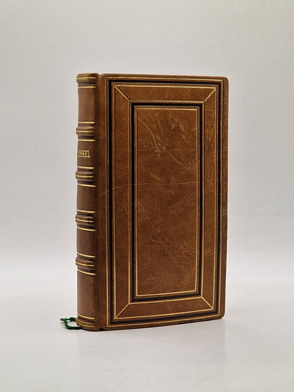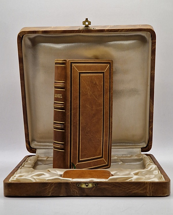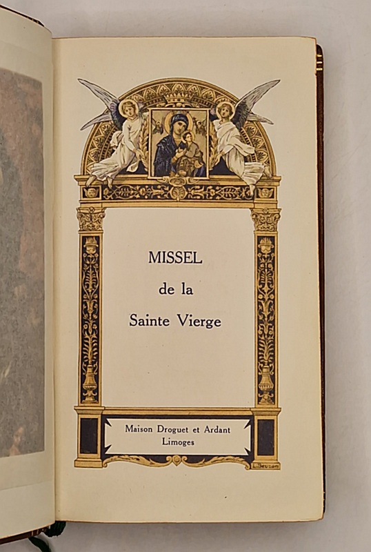 Limoges, Droguet et Ardant, 1944 ; in-16 relié plein veau blond glacé, dos à nerfs, double encadrement noir et or sur les plats, tranches dorées, encadrement de triple filet doré en garde, ex-dono manuscrit en page de garde daté de 1958, deux planches en couleurs, à chaque page bel encadrement cobalt et or comportant une vignette centrale, 299 pp. Charmant exemplaire présenté dans son coffret d'origine, accompagné d'une petite bourse de cuir contenant un chapelet de nacre.