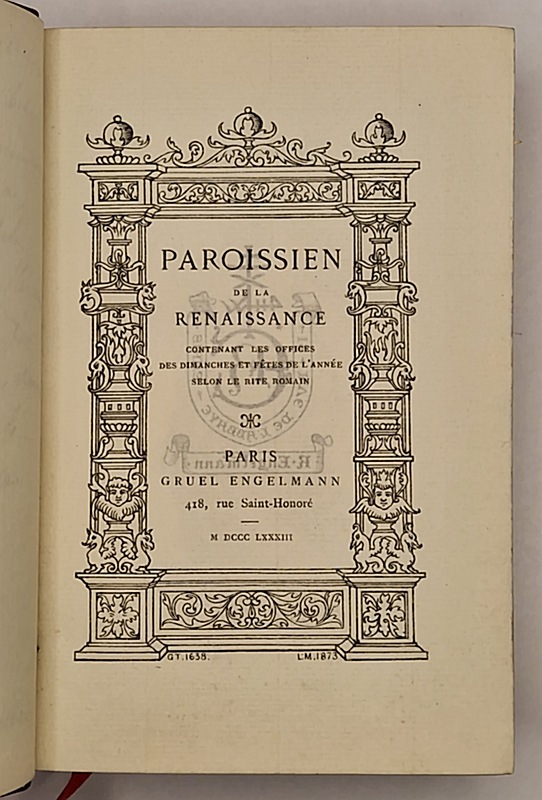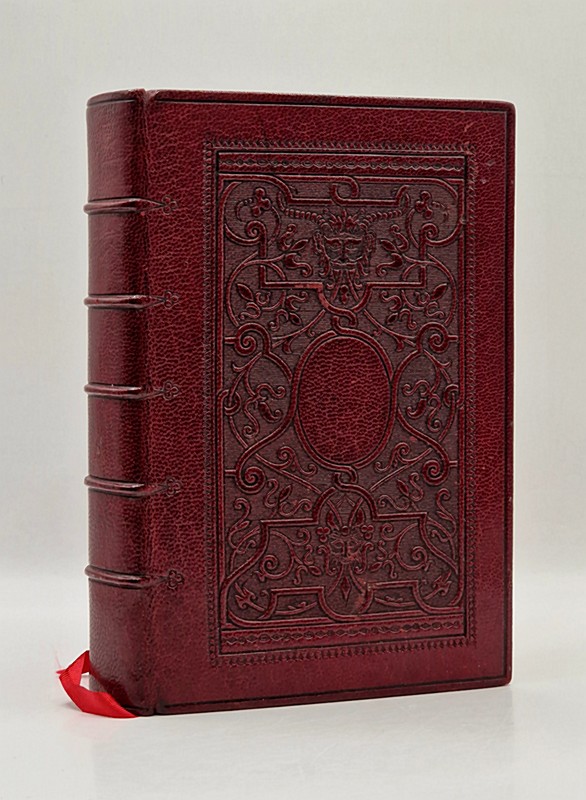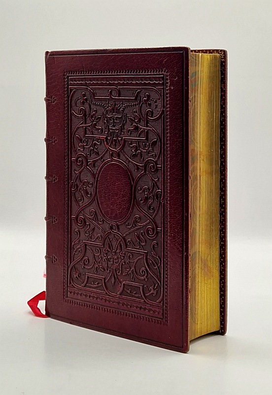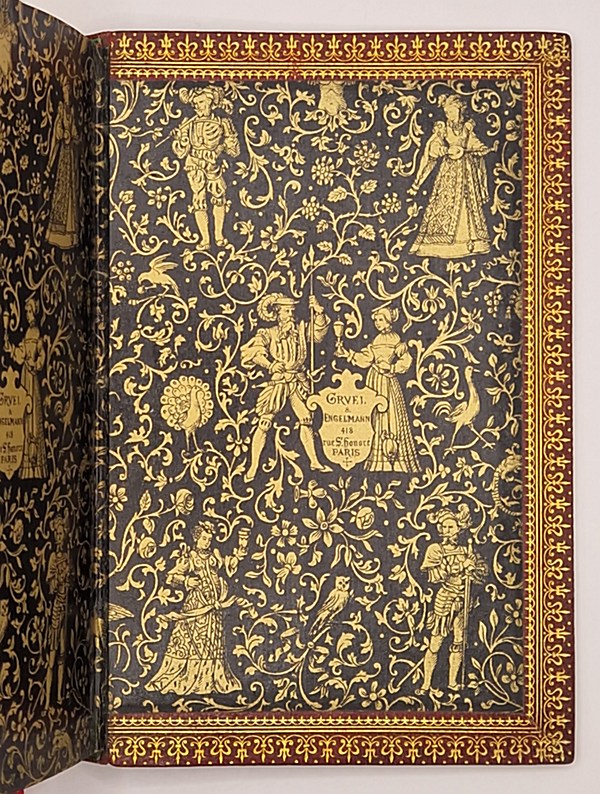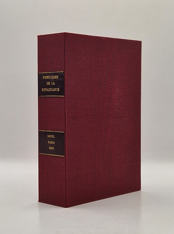 Paris, Gruel et Engelmann, 1883 ; in-12 relié plein maroquin grenat, superbe décor estampé style Renaissance sur les plats, dos à nerfs signé « Gruel » en pied (dos muet, infime impact au centre de l'un des caissons), tranches dorées sur marbrures, gardes de papier noir et or de la maison Gruel et Engelmann illustré de personnages de la Renaissance, roulette intérieure dorée, long envoi manuscrit daté de 1909, titre-frontispice, six belles gravures hors texte (dont frontispice), on trouve à chaque page un bel encadrement à la manière des décors gravés du XVIe siècle, 631 pp. Accompagné d'un coffret cartonné et toilé rouge, récemment conçu sur mesure. Superbe exemplaire.