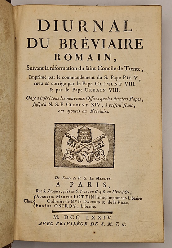 Suivant la réformation du saint Concile de Trente. Imprimé par le commandement du S. Pape Pie V, revu & corrigé par le Pape Clément VIII. & par le Pape Urbain VIII. On y a inséré tous les nouveaux Offices que les derniers Papes, jusqu'à N . S. P. Clément XIV, à présent séant, ont ajoutés au Bréviaire.