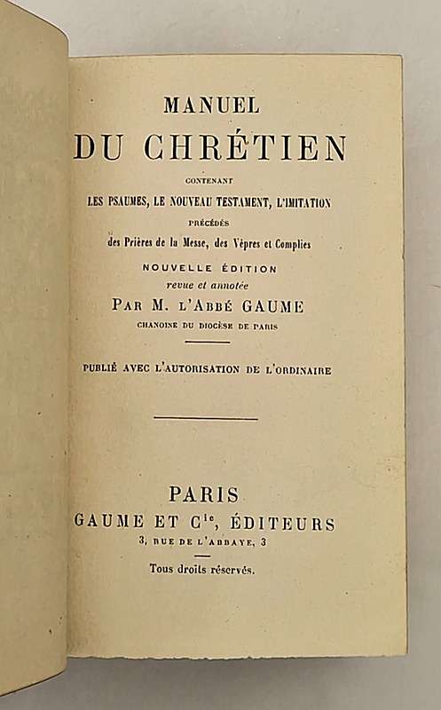 Contenant les Psaumes, le Nouveau Testament, l'Imitation. Précédés des Prières de la Messe, des Vêpres et Complies. Nouvelle édition revue et annotée par M. l'abbé Gaume.