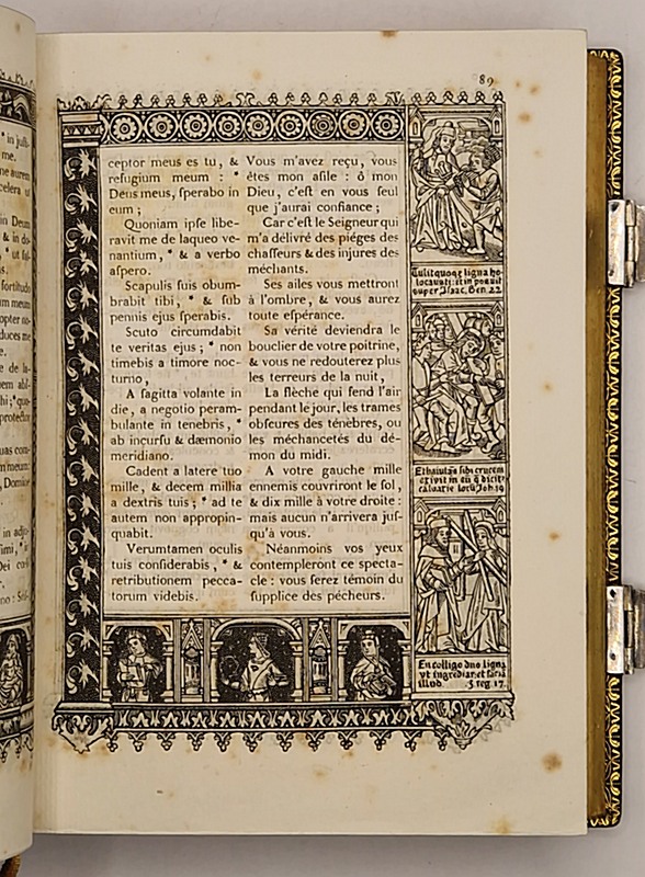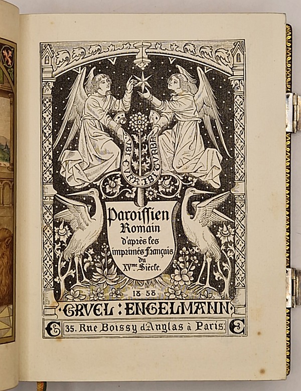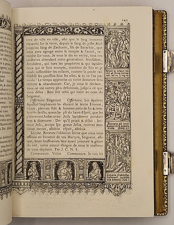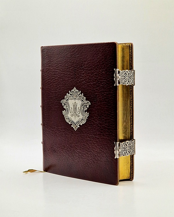 Paris, Gruel et Engelmann, 1858 ; in-12 relié plein maroquin prune, dos à nerf, reliure d'Augustin Petit, plaque d'argent finement monogrammée « M. A. » au centre du premier plat, double fermoir d'argent niellé, tranches dorées sur marbrure, gardes de moire prune, large dentelle intérieure dorée, beau frontispice chromolithographié représentant saint Marc, titre-frontispice, quelques rousseurs éparses, texte illustré à chaque page d'un large encadrement d'inspiration médiévale, deux gravures hors texte, 703 pp. Accompagné d'un coffret cartonné et toilé bordeaux récemment conçu sur mesure.