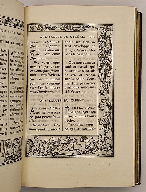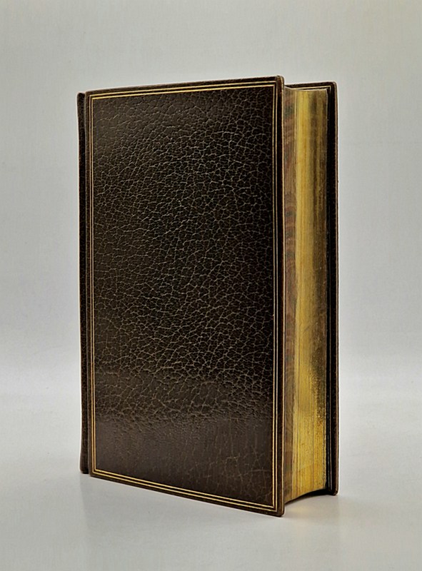 Paris, Gruel et Engelmann, 1883 ; in-12 relié plein maroquin brun, dos plat orné d'un double encadrement de filets dorés, encadrement de double filet doré sur les plats, tranches dorées sur marbrures, gardes de moire brune, large encadrement de filets dorés, six belles gravures hors texte (dont frontispice), on trouve à chaque page un bel encadrement à la manière des décors gravés du XVIe siècle, 631 pp. Accompagné d'un coffret cartonné et toilé brun, récemment conçu sur mesure. Très bel exemplaire.