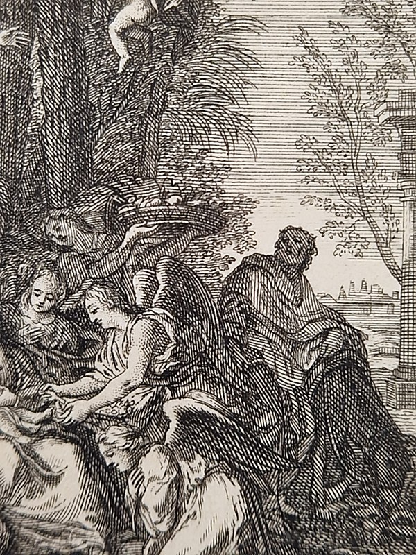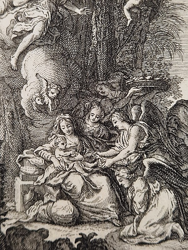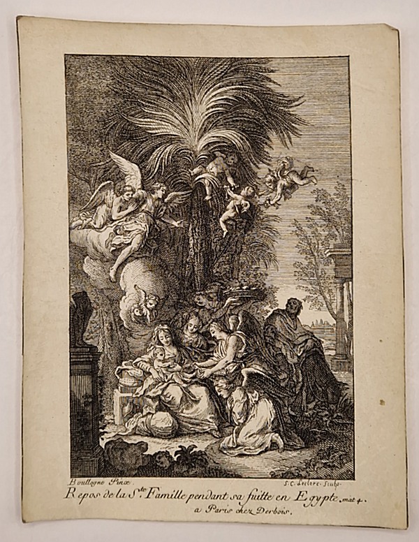Paris, Derbois, s. d. [fin XVIIe début XVIIIe siècle], 10 x 13 cm. Gravure au burin signée « S. C. Leclerc. » représentant le repos de la Sainte Famille pendant la fuite en Égypte, accompagnée d'un groupe d'anges et de putti ; Joseph, en arrière-plan, se tient dans l'ombre d'un dattier.