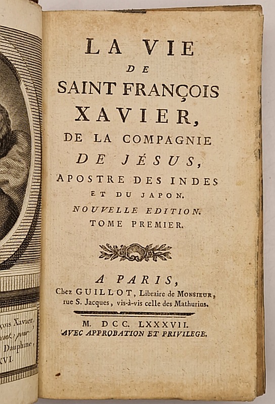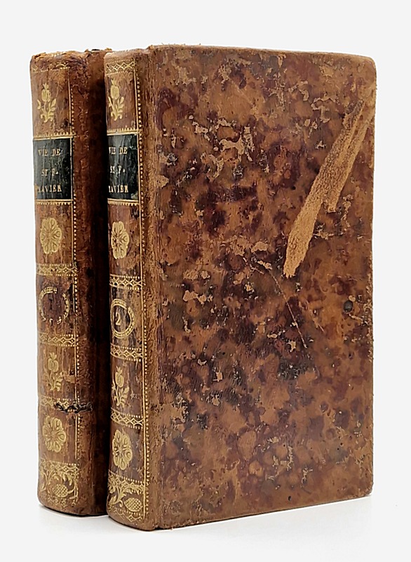 Paris, Guillot, 1787 ; 2 vol. in-12 reliés pleine basane havane (épidermures), dos lisse orné (petite perforation du dos du tome II, sans gravité), tranches marbrées, ex-libris manuscrits anciens et imprimés, beau portrait-frontispice de Benoît-Louis Henriquez représentant François Xavier, 442-(2) et 32-418 pp.