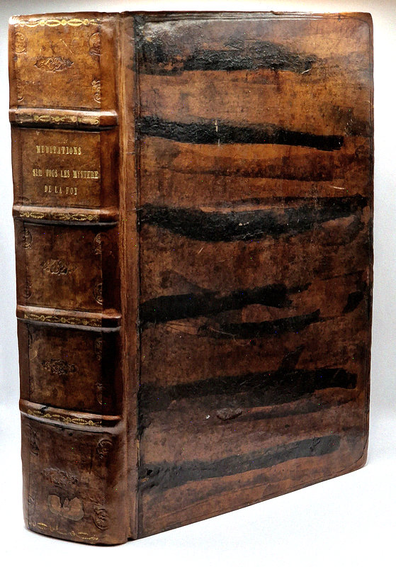 Texte sur deux colonnes, importants travaux de vers dans la marge intérieure de nombreux feuillets des Méditations (rares atteintes des références marginales), deux ex-libris modernes en garde et un ancien sur le titre-frontispice, tampons, bandeaux, lettrines, bandeaux et culs-de-lampe, (18)-448-(20)-381-(13) pp.