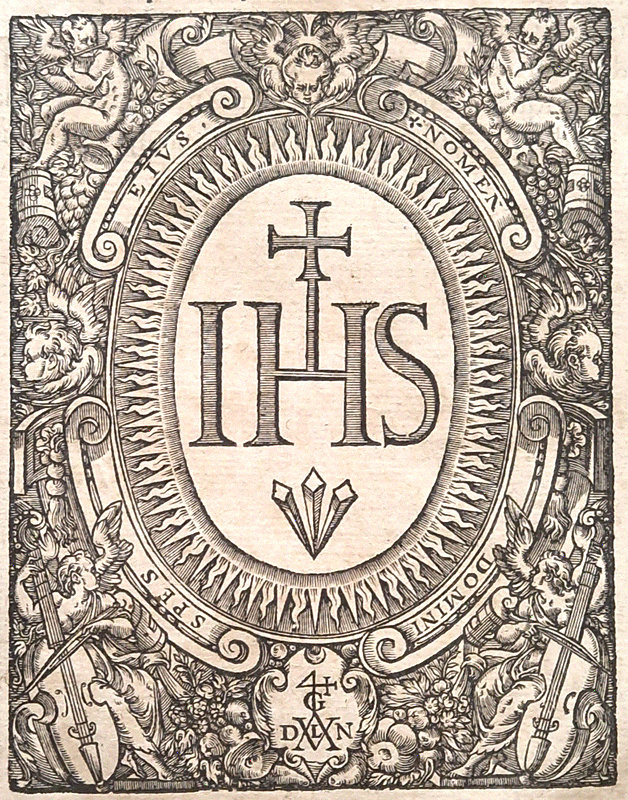 Beau titre-frontispice (petit renfort de japon en marge supérieure), quatre portraits-médaillons aux angles représentant de grands personnages de la Compagnie encadrant le Christ et la Vierge.