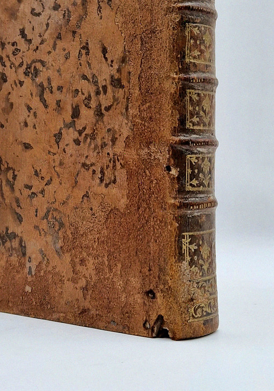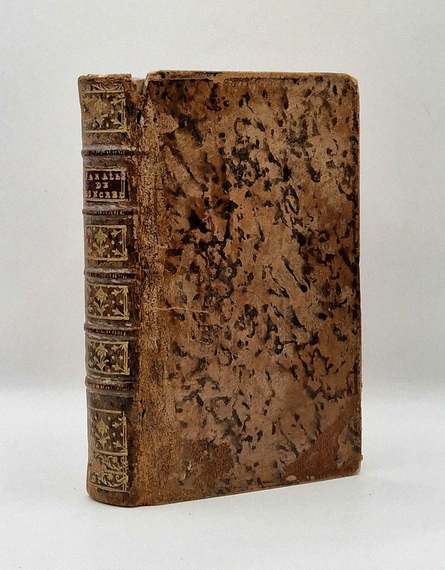 Paris, Babury, 1758 ; in-12 relié pleine basane de l'époque (petits manques de cuir dus à un travail de ver au niveau des mors, épidermures, coins émoussés), dos à nerfs orné (coiffe supérieure absente), pièce de titre rouge, tranches rouges, vignette de titre, deux bandeaux historiés gravé sur bois, lettrines et culs-de-lampe, LVI-400 pp.