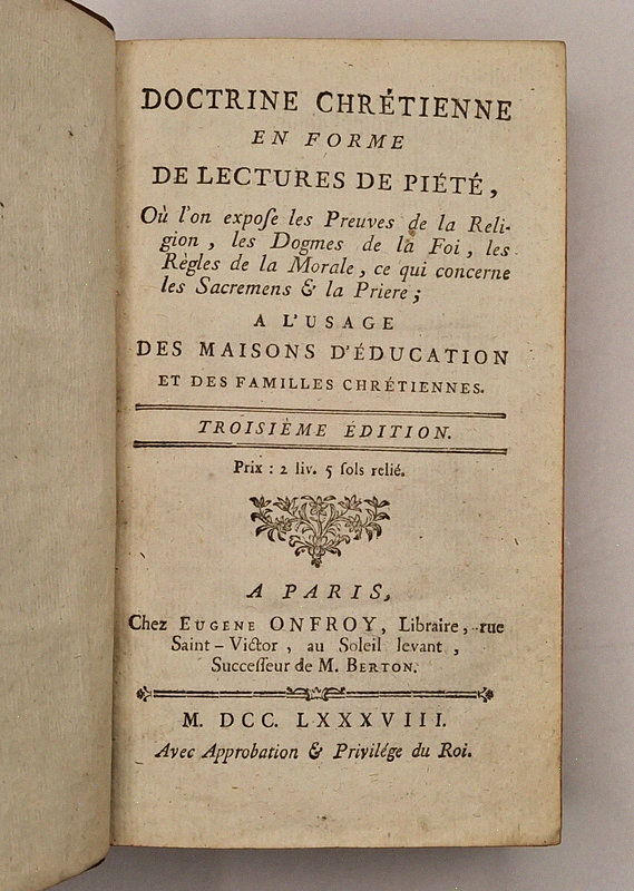 Paris, Eugène Onfroy, 1788 ; in-12 relié pleine basane de l'époque (coins usés), dos à nerfs richement orné (coiffes absentes), bonne fraîcheur intérieure, IV-552 pp.