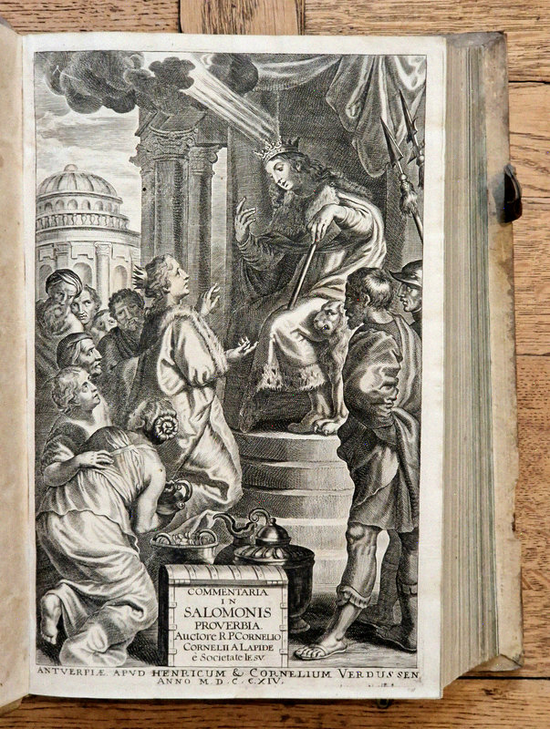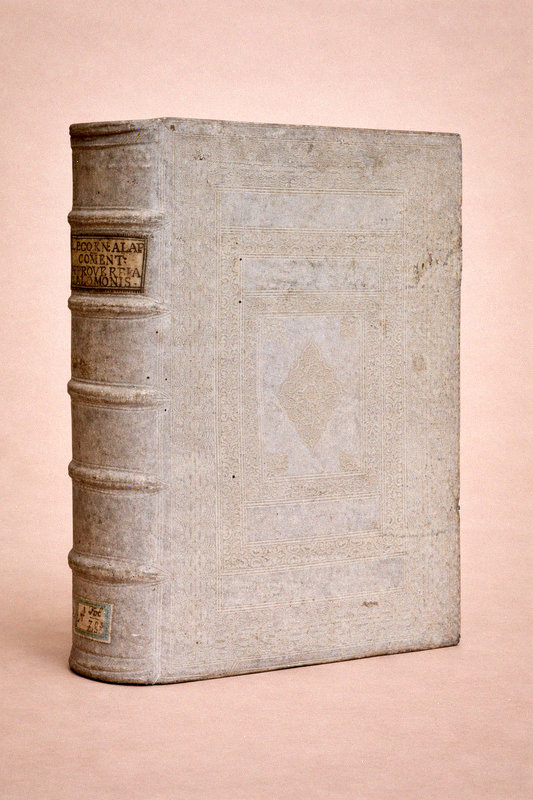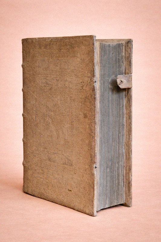 Antverpiae [Anvers], Apud Henricum & Cornelium Verdussen [Henri et Cornelius Verdussen], 1714 ; fort in-4° relié pleine truie sur ais de bois – reliure légèrement biseautée –, dos à nerfs, pièce de titre de vélin, petite étiquette en pied de volume, plats estampés d'une composition de roulettes et de rinceaux, restes de fermoirs, ex-libris moderne, vignette de titre, culs-de-lampe, texte sur deux colonnes, (4)-903-(82) pp.