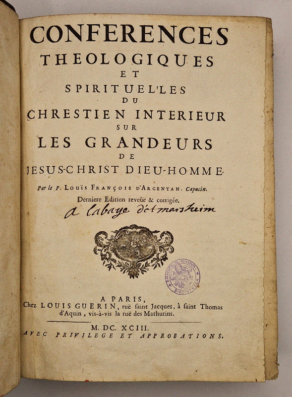 Paris, Louis Guérin, 1693 ; in-4° relié plein veau de l'époque (épidermures), dos à nerfs richement orné, tranches mouchetées de noir, reliure ancienne et solide, ex-libris moderne, tampons, vignette de titre, bandeaux, lettrines et culs de lampe, (20)-752-(22) pp.