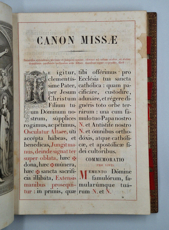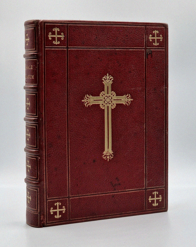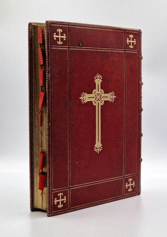 Tours, Mame, 1892 ; in-4° relié plein chagrin rouge (infimes salissures et menus défauts), dos à nerfs orné, reliure signée « Lesort » en pied, grande croix centrale et petites croix dorées aux quatre coins de chaque plat, tranches dorées, onglets de tissu (dont deux détachés), texte rouge et noir sur deux colonnes, une grande planche gravée, XLIV-484-172*-64 pp.