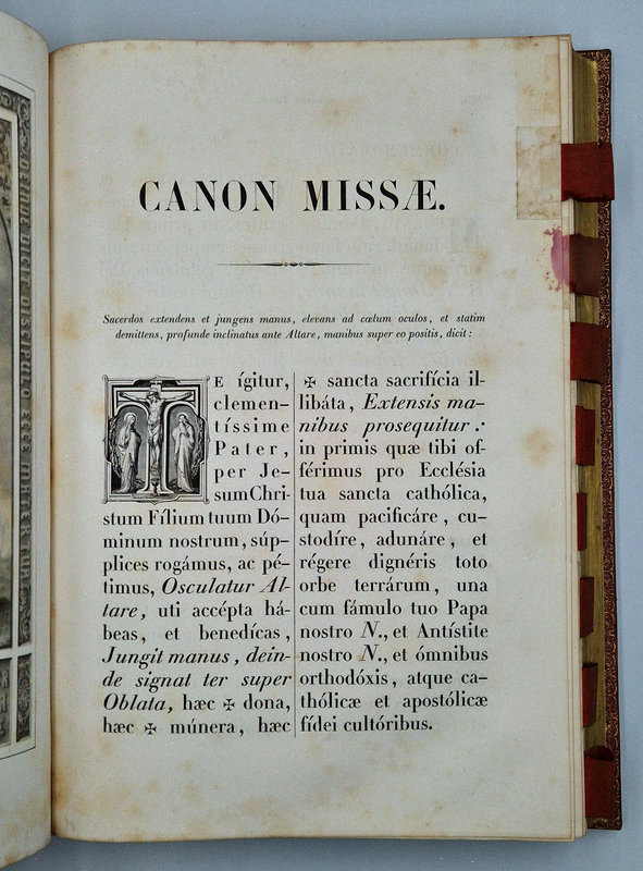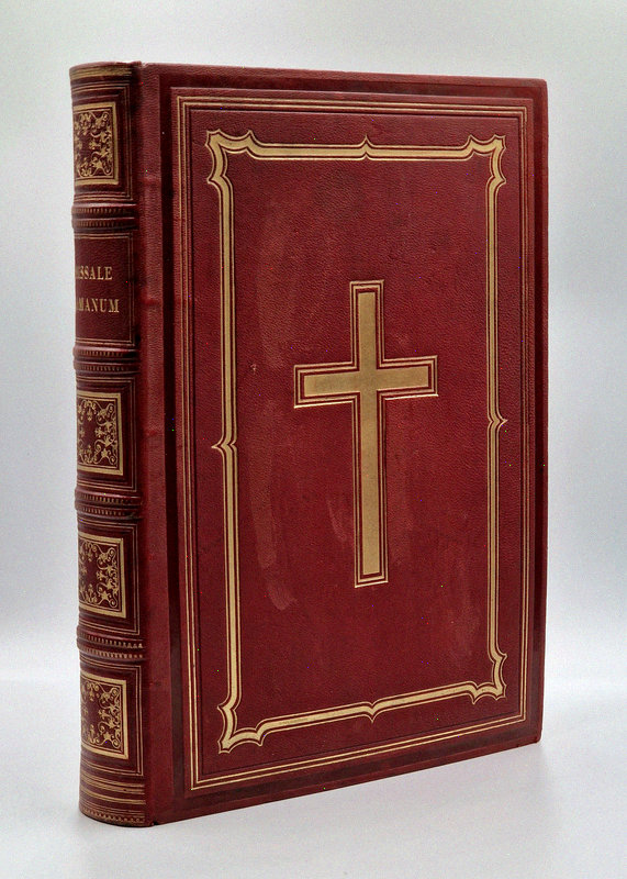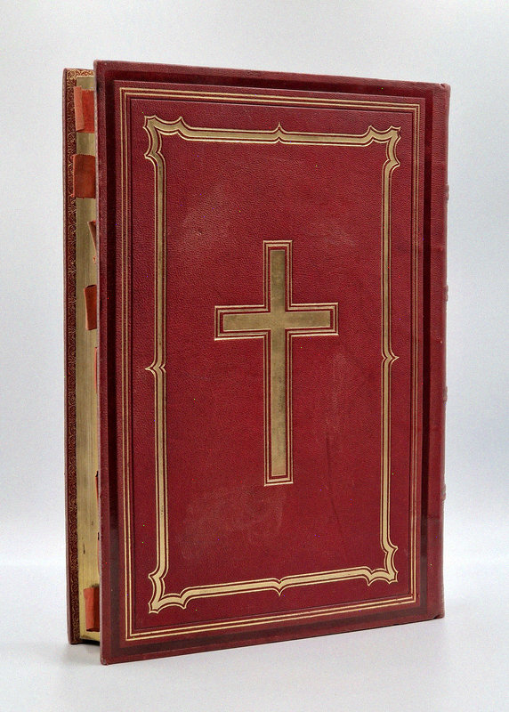 Tours, Mame, 1893 ; in-4° relié plein chagrin rouge, dos à nerfs richement orné, grande croix dorées au centre de chaque plat, tranches dorées, onglets de tissu, ex-libris moderne, texte sur deux colonnes, une grande planche gravée, XLIV-551-176* pp.