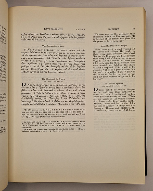 New York, American Bible Society, 1966 ; in-8° relié pleine toile bleue, texte grec et traduction anglaise en regard, LVII-920 pp.