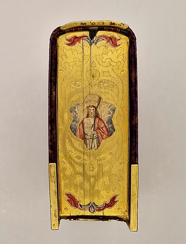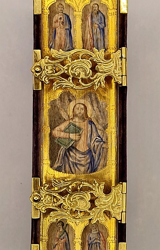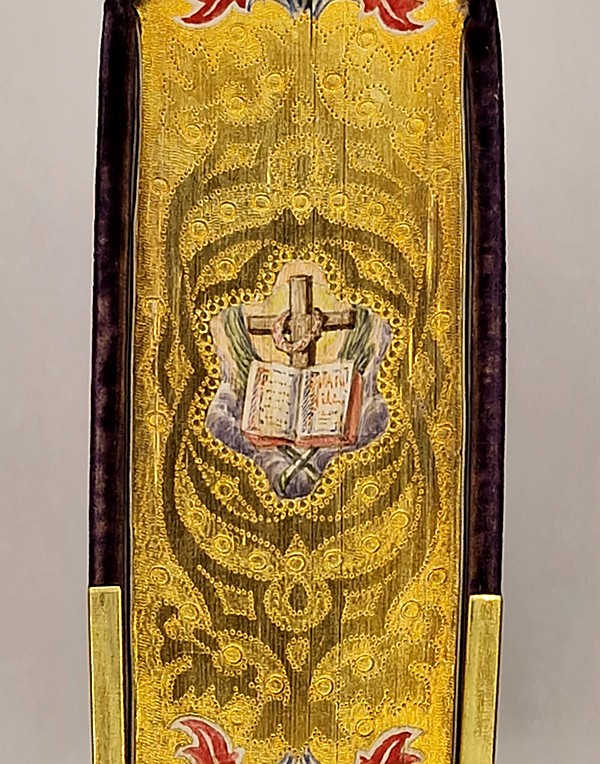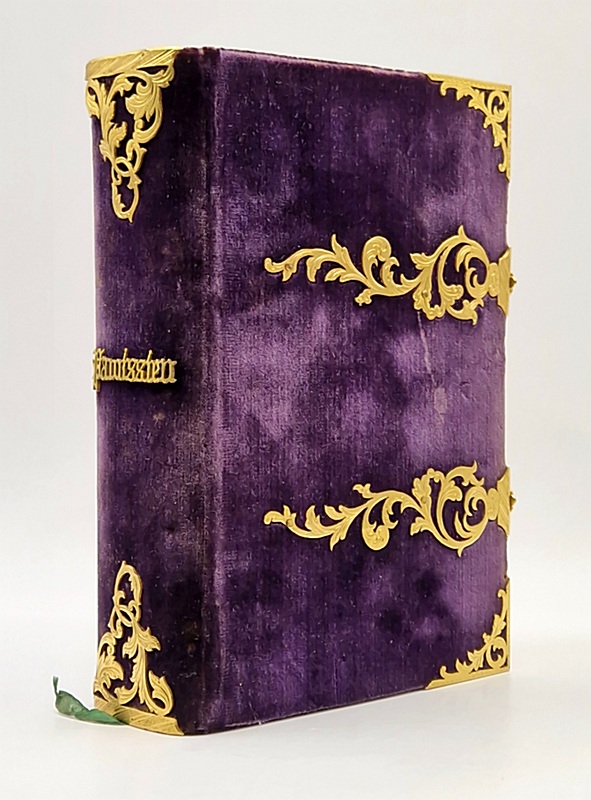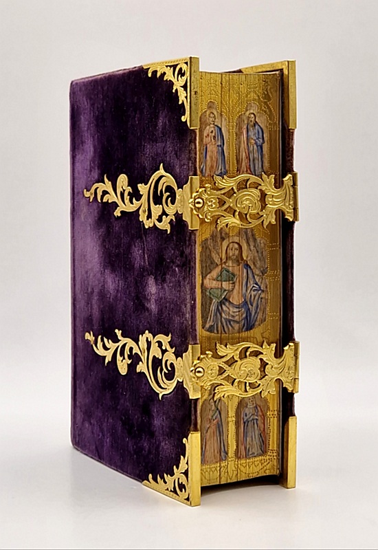 Paris, Mme Vve Louis-Janet, 1844 ; in-12 relié plein velours de soie violet, dos plat portant titre et motifs végétaux en pied et en tête, deux fermoirs richement ouvragés débordant sur les plats et cornières en métal doré, frontispice, vignette au faux-titre, trois planches gravées hors texte, (8)-871 pp. Toutes tranches dorées et finement ciselées avec très belles représentations évangéliques peintes en couleurs et à la main : un Christ au roseau en tête, un Christ tenant un livre accompagné de quatre saints personnages sur la gouttière et, en queue, les Saintes Écritures surmontées d'une croix couronnée. Très bel exemplaire, unique.